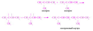 ожно считать, что макромолекулы каучука образованы молекулами изопрена. Представим этот процесс схематично. Сначала за счёт разрыва двойных связей происходит соединение двух молекул изопрена: