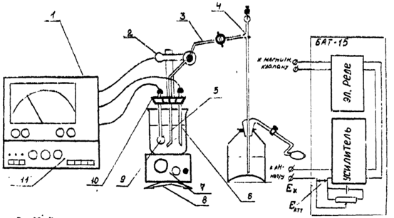 Схема установки для потенциометрического титрования с автоматической фиксацией конечной точки титрования и функциональная схемав БАТ-15 представлены на рис. 3.