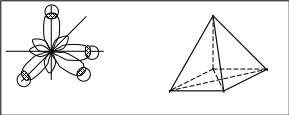 В данном преобразовании учавствуют одно s-облако и три р-облака, поэтому такая перестройка называется sp3-гибридизацией. Как видно из рис.4.12. в результате гибридизации не только изменяется форма облаков, изменяется также взаимное расположение облаков, увеличиваются углы между новыми (гибридными) орбиталями. Гибридное состояние атома приобретает своеобразную геометрическую конфигурацию, которая и предопределяет геометрическую структуру молекулы.