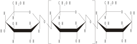 Крахмал образуется в растениях пи фотосинтезе и откладывается в корнях, клубнях и семенах. Внешний вид крахмала хорошо известен: это белое вещество, состоящее из мелких зерен. Он нерастворим в холодной воде, набухает и постепенно растворяется в горячей. Образующиеся вязкие растворы при охлаждении превращаются в студневидную массу – клейстер. Крахмал представляет собой смесь полисахаридов – амилопектина и амилозы. Применяя особую обработку растворителями, из крахмала можно выделить чистую, кристаллическую амилозу. Чистая амилоза не образует при набухании клейстера, с йодом дает характерное темно-синее окрашивание; амилопектин ответственен за образование клейстера, а с йодом дает слабое фиолетовое окрашивание. И амилоза, и амилопектин состоят из остатков, связанных α- гликозидными связями, однако они различаются формой молекул. Амилоза представляет собой линейный полисахарид, построенный из нескольких тысяч остатков глюкозы, соединенных α-глюкозидной связью. Строение амилозы схематически выражается следующей формулой: