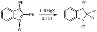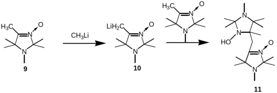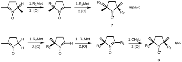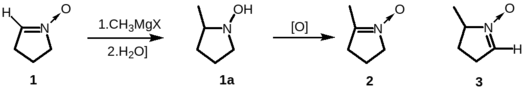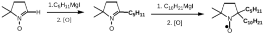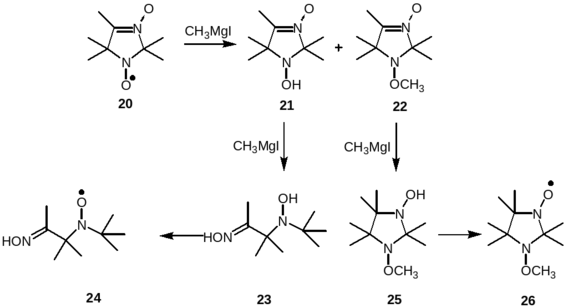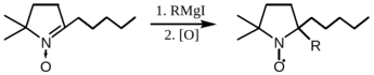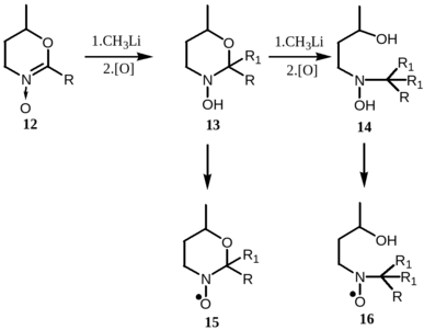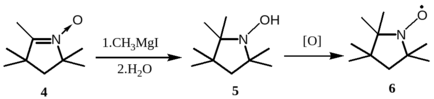 присоединение реактива Гриньяра к замещённым нитронам типа 4 приводит к образованию пространственно-затруднённого производного гидроксиламина 5, окисление которого приводит к стабильному нитроксильному радикалу 6. Часто окисление происходит настолько легко, что нитроксильный радикал является основным продуктом реакции и гидроксиламин не удаётся выделить вообще.15
