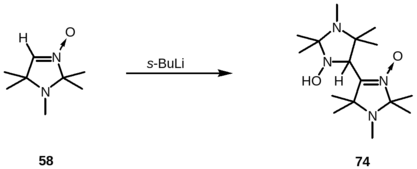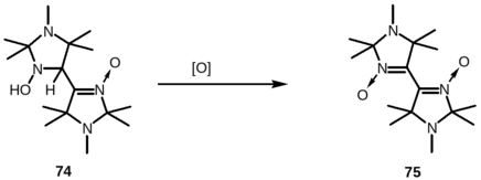 На основании спектральных данных и данных элементного анализа полученному соединению была приписана структура 1,2,2,5,5,1',2',2',5',5'-декаметил-1,2,4,5,2',5'-гексагидро-1'H-[4,4']биимидазолил-3-ол-3'-оксида 74.
