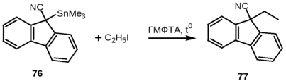 Взаимодействие активных алкилирующих реагентов с оловоорганическими соединениями, содержащими сильные электроноакцепторные группы, происходит и без участия катализатора.44 Так, взаимодействие триметил-9-цианофлуоренилстаннана 76 с иодистым этилом в ГМФТА приводит к образованию соответствующего продукта алкилирования 77 и без участия катализатора с выходом 50 %.