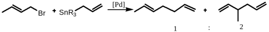 Взаимодействие аллибромидов с аллилоловоорганическими реагентами осложняется образованием продуктов аллильной перегруппировки.47 Соотношение продуктов реакции принципиально можно изменить, варьируя заместители уходящей группы оловоорганического реагента, а также используя различные катализаторы, сокатализаторы и растворители.