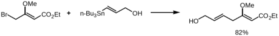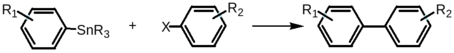 Успешной реализацией данного подхода является разработка нового препаративного метода синтеза, основанного на использовании оловоорганических соединений. Взаимодействие органостаннанов с электрофильными реагентами, катализируемое комплексными соединениями Pd(0), получило именное название реакции Стилле. Отличительной особенностью реакции Стилле является высокая толерантность как молекулы реагирующего нуклеофила (органостаннана), так и электрофила к наличию различных функциональных групп. В литературе имеются многочисленные примеры успешного проведения реакции Стилле в присутствии сложноэфирной, нитрильной, альдегидной и даже гидроксильной группы.