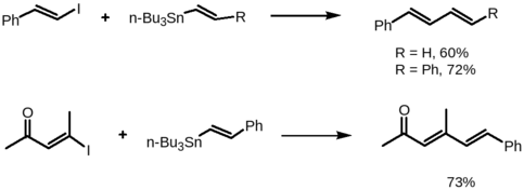 Так, винилгалогениды взаимодействуют с винилорганостаннанами при комнатной температуре с образованием арилсодержащих диенов.