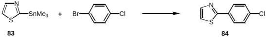 Органостаннан 83 – производное тиазола, селективно реагирует с 4-бромхлорбензолом по атому углерода, замещённому бромом, с образованием хлорсодержащего продукта реакции 84 с выходом 80 %.52