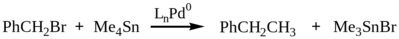 Взаимодействие бензилбромида с тетраметилоловом в присутствии каталитических количеств комплексных соединений палладия (0) с высоким выходом приводит к образованию фенилэтана.45