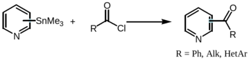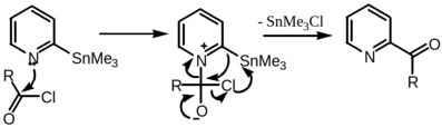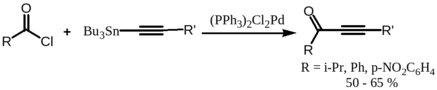 Хлорангидриды кислот реагируют с органостаннанами в условиях реакции Стилле с образованием кетонов. Реакция не осложняется образованием третичных спиртов, что зачастую наблюдается при взаимодействии литий- и магнийорганических соединений с хлорангидридами кислот.Error: Reference source not found