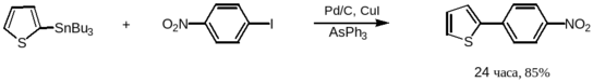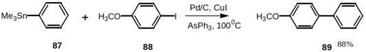 Авторами данной работы предложена удобная модификация реакции с использованием доступного катализатора – палладия на твёрдом носителе углероде (Pd/C). При использовании в качестве электрофильного реагента арилгалогенидов, содержащих метоксигруппу, наблюдалось образование бифенила, являющегося продуктом побочной реакции диметоксилирования. На примере реакции трибутилфенилстаннана 87 с пара-иоданизолом 88 подобраны оптимальные условия проведения реакции. Оказалось, что использование добавок 10% CuI и 20% AsPh3 позволяет практически полностью подавить реакцию образования бифенила, а выход целевого продукта 89 составил 88 % в отличие от 46 % выхода, наблюдаемого при использовании только лишь Pd/C.