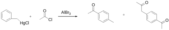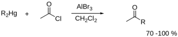 Ртутьорганические соединения вступают в реакцию ацилирования. В качестве ацилирующих агентов используют ацилгалогениды в присутствии каталитических количеств солей палладия или же кислот Люиса. Выходы соответствующих кетонов обычно достаточно велики и составляют от 70 до 100 %.66