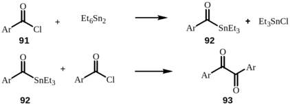 Симметричные 1,2-дикетоны могут быть получены из хлорангидридов ароматических кислот. Реакция проводится с ½ эквивалента Et6Sn2, взаимодействие которого с хлорангидридом бензойной кислоты 91 приводит к образованию оловоорганического реагента 92, взаимодействие которого в свою очередь с хлорангидридом кислоты 91 приводит к образованию продукта реакции 93.