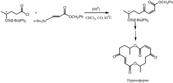 Реакция образования кетонов активно используется в синтезе природных соединений. Так, ключевой интермедиат в синтезе антибиотика пуренофорина был получен по реакции Стилле, причём реакция происходит с сохранением Z-конфигурации реагирующего ,-ненасыщенного сложного эфира.59