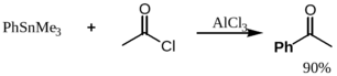 В 1942 году советскими химиками было показано, что алкил- и арилстаннаны реагируют с ацилирующими агентами в присутствии AlCl3.56