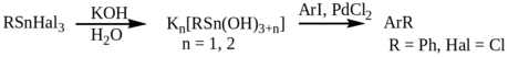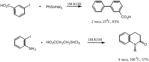Оловоорганические гидроксиды, полученные взаимодействием едкого калия с бензотрихлоридоловом, были успешно использованы в синтезе биарилов в водной среде.55