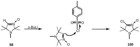 Так, взаимодействие литиированного нитрона 58 с пара-толуолсульфохлоридом с высоким выходом приводит к образованию соединения, дающего положительную пробу Бельштейна на присутствие атома галогена. В спектре ЯМР 1Н полученного соединения наблюдаются лишь сигналы протонов геминальных метильных групп имидазолинового цикла при 1.1 и 1.3 м.д. и протонов группы N-CH3 при 2.2 м.д. В спектре ЯМР 13С полученного соединения наблюдаются лишь сигналы атомов углерода геминальных метильных групп при 23.43 и 23.75 м.д. и группы N-CH3 при 27.25 м.д., сигналы атомов углерода в положении 2 и 5 имидазолинового цикла при 63.28 и 90.26 м.д., и сигнал при 132.46 м.д., отнесённый к резонансу атома углерода нитронной группы. В масс-спектре полученного соединения имеется пик молекулярного иона с массой 190.08729 м.д., соответствующей соединению с брутто формулой С8Н15N2OCl. На основании данных элементного анализа и спектральной информации полученному соединению была приписана структура 4-хлоро-1,2,2,5,5-пентаметил-3-имидазолин- 3-оксида 100.