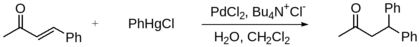 Взаимодействие ртутьорганических соединений с α,β-ненасыщенными карбонильными соединениями происходит исключительно как 1,4-нуклеофильное присоединение. Реакция проводится в кислой среде (активирование карбонильного соединения) в присутствии каталитических количеств солей палладия в условиях межфазного переноса.