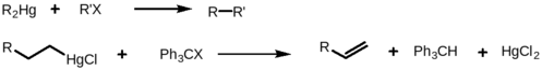 Ртутьорганические соединения находят несравненно меньшее применение в современном органическом синтезе по сравнению с оловоорганическими соединениями, несмотря на то, что ртутьсодержащий заместитель также проявляет исключительную совместимость с различными функциональными группами.