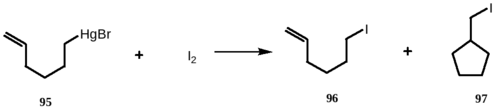 Так, при взаимодействии 6-бромомеркурогексена-1 95 с йодом наряду с ожидаемым продуктом электрофильного замещения 96, происходит образование циклического продукта 97. 62