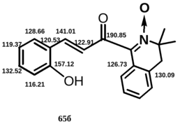 3-(2-Метоксифенил)-1-(1,2,2,5,5-пентаметил-3-имидазолин-3-оксид-4-ил)-пропенон 67. ЯМР 1Н (СDCl3, d, м.д.): 1.44 (c, 3H, CH3), 1.50 (c, 3H, CH3), 2.36 (c, 3H, NCH3), 3.86 (c, 3H, ОCH3), 6.6 –7,0 (м, 2H, аром.), 7.3 – 7,4 (м, 1Н, аром.), 7.6 – 7,7 (м, 1Н, аром.), 8.18 (с, 2Н, СН=СН). ЯМР 13C (DMSO-d6, d, м.д.): 23.61, 24.27 (СH3), 26.51 (NСH3), 55.48 (OСH3), 64.17 (C2), 92.59 (С5), 111.06, 120,59, 128.67, 131.60 (аром.), 124.06 (ипсо-аром.), 124.64 (С=С-Ar), 139.60 (С=С-Ar), 143.20 (С=N), 156.60 (MeO-С-аром.), 182.40 (С=О).