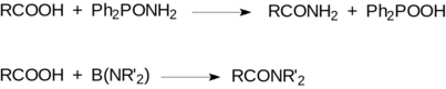 ислоты можно превратить в амиды также нагреванием с амидами других карбоновых кислот (обмен), сульфоновых или фосфиновых кислот или действием трис(алкиламино)боранов [B(NHR’)3] или трис(диалкиламино)боранов [B(NR’2)3]: