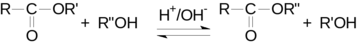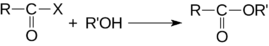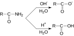 езамещенные амиды RCONH2 способны гидролизоваться под действием как кислотных, так и основных катализаторов; при этом образуются соответствующая свободная кислота и ион аммония или соль кислоты и аммиак. Алкоголиз ацилгалогенидов.