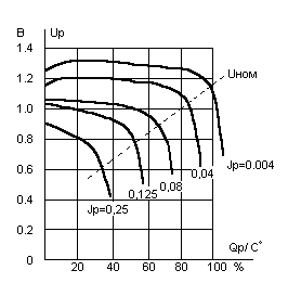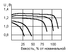 При пониженных температурах работоспособность элементов ухудшается. При 00С снижение емкости начинается при jp=0,005, и внутреннее сопротивление по сравнению с сопротивлением при комнатной температуре возрастает в 2-3 раза. При температуре -200C иjp=0,002 элементы обладают только около 20% номинальной емкости.