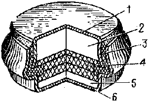 Рис.1. Устройство ртутно-цинкового элемента: 1 - крышка (отрицательный полюс); 2 - цинковый электрод; 3 - резиновое уплотнительное кольцо; 4 - бумага, пропитанная электролитом; 5 - ртутний электрод; 6 - корпус (положительный полюс).
