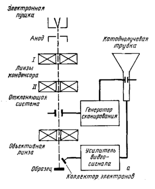 Наиболее универсальное значение имеют регистрация вторичных электронов и регистрация отраженных (или «рассеянных обратно») электронов. Те и другие электроны улавливаются коллектором, установленным возле образца, преобразуются в электрический сигнал, который усиливается и затем направляется к электронно-лучевой трубке, где он модулирует яркость электронного луча, строящего изображения на экране этой трубки.