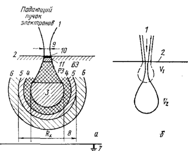 1—падающий пучок электронов; 2 — поверхность объекта (мишень); 3—первичное возбуждение рентгеновских лучей; 4 — граница возбуждения рентгеновских лучей торможения; 5—область возбуждения вторичного (флюоресцентного) рентгеновского излучения; 6 — область рассеяния рентгеновских лучей и дифракция Косселя; 7—ток образца; 8 — возможное разрешение для рентгеновского микроанализатора (Rх); 9—диаметр зонда; 10 — область, от которой регистрируются ОЖЕ- электроны: 11 — ВЭ и РЭ- области, от которых регистрируются вторичные и упруго рассеянные электроны V1; V2 — области возбуждения при разном ускоряющем напряжении; V1> V2 [8]