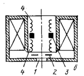 1—сетка; 2—сцинтиллятор; 3— светопровод ; 4— фотокатод или фотоэлектронный умножитель; 5—изолятор; 6 — металлический стакан;