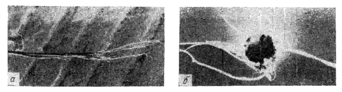 а — конец волокна, выдернутого из соединения; б — отверстие в смоле после выдергивания волокна