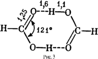 лагодаря водородным связям молекулы объединяются в ассоциаты (димеры или полимеры). Последние могут иметь линейное, разветвленное или кольчатое строение. Так, муравьиная кислота как в жидкой, так и в газообразной фазе существует главным образом в виде димера; его структура установлена методом электронографии (см. рис.3). Способность к ассоциации отличает воду, спирты, и многие другие жидкости от неассоциированных жидкостей (например от углеводородов). Ассоциация приводит к повышению температуры плавления, температур сублимации и кипения, теплоты парообразования, а также к изменению взаимной растворяющей способности веществ.