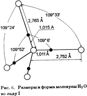 Важную роль водородные связи играют в структуре воды и льда. На рис. 6 показан фрагмент структуры льда Ι. Каждый атом кислорода в этой структуре тетраэдрически связан с четырьмя другими атомами кислорода, между ними располагаются атомы водорода; два атома водорода соединены с данным атомом кислорода полярной ковалентной связью (d=1,011Ǻ), два других — водородной связью (d=1,752 Ǻ; EO…H ≈ 5ккал/моль), т.е. входят в состав двух других молекул H2O. Создается ажурная структура, далекая от плотной упаковки. Отсюда небольшая плотность и значительная рыхлость льда. При плавлении льда водородные связи частично разрушаются (примерно на 10%); это несколько сближает молекулы, поэтому вода немного плотнее льда. Нагревание воды, с одной стороны, приводит к ее расширению, т.е. к увеличению объема, с другой стороны, оно вызывает дальнейшее разрушение водородных связей и тем самым уменьшение объема. В результате плотность воды проходит через максимум (при 4oC).