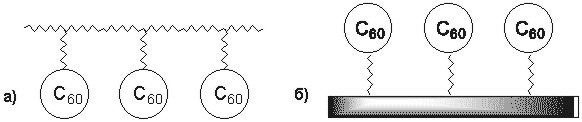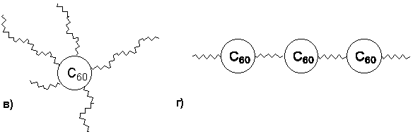 Рисунок 4. Четыре прототипа полимеров, включающие структурную единицу C60: а) прикрепленные к цепи, б) прикрепленные к поверхности (привитые), в) дендритные (ветвящиеся), г) цепочечные.