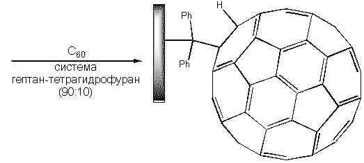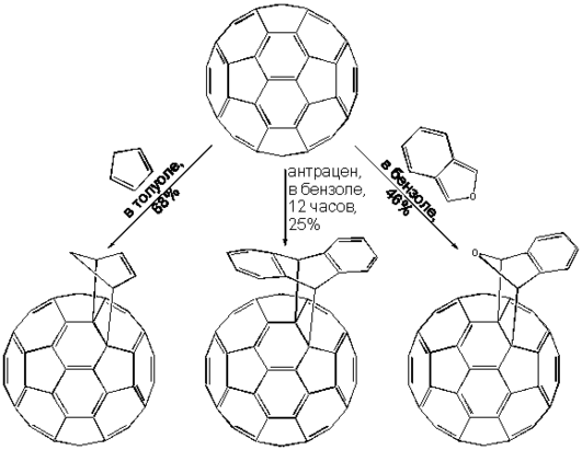 аиболее типичными являются реакции Дильса-Альдера ([4+2]циклоприсоединение), в которых фуллерен выступает в качестве диенофила. В случае активных диенов характер устанавливающегося равновесия таков, что выход аддуктов весьма высок, а их очистка возможна методами жидкостной хроматографии с использованием толуола в качестве элюента: