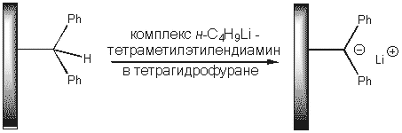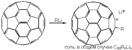 уллерен-60 легко взаимодействует с литийорганическими соединениями и реактивами Гриньяра, образуя в качестве первичных интермедиатов анионы RC60-. Процесс проходит очень быстро; например, в толуоле осадок солей выпадает практически мгновенно: