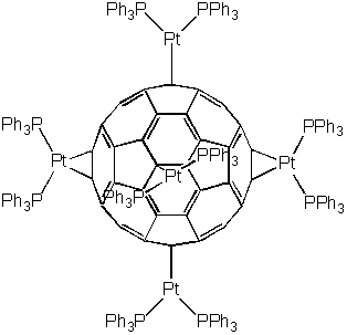 нтересно, что образование комплекса, включающего шесть атомов платины, и соответственно имеющего на 6 двойных связей меньше, чем исходный фуллерен, увеличивает степень делокализации электронов в оставшихся бензольных кольцах. Иными словами, образовавшаяся структура имеет более ароматический характер, чем сам фуллерен-60. Проявлением этого является уравнивание длин углерод-углеродных связей в восьми шестиугольниках: