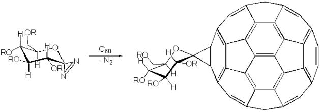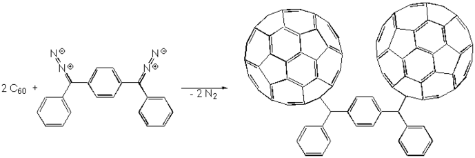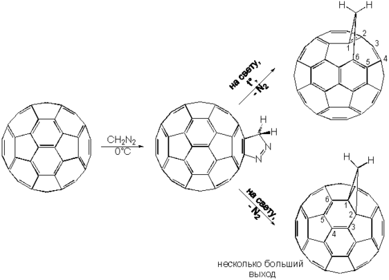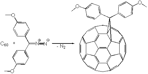ругим важным типом реакций циклоприсоединения является реакция с диазометаном ([3+2]циклоприсоединение), в ходе которого фуллерен ведет себя как 1,3-диполярофил. При обработке раствора C60 в толуоле диазометаном интермедиат (пиразолин) оказывается относительно устойчивым, как показал Вудль, и разлагается на смесь изомеров только под действием света: