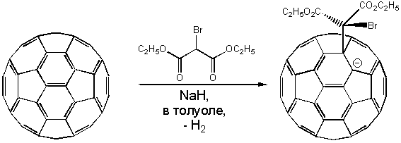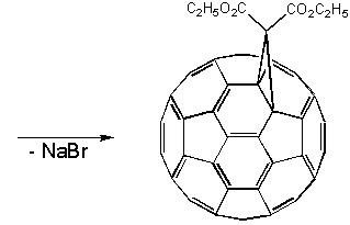 Стабилизация активных интермедиатов RC60- может быть осуществлена путем внутримолекулярного нуклеофильного замещения (SNi), если R представляет собой уходящую группу. Как показал Бингель, при взаимодействии с -галогенэфирами и -галогенкетонами осуществляется гладкое циклопропанирование фуллерена, например, реакция с броммалоновым эфиром (диэтилброммалонатом) с участием гидрида натрия в толуоле осуществляется при комнатной температуре, причем моноаддукт может быть в