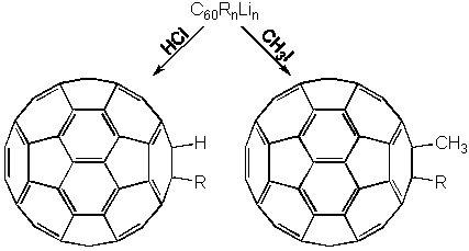 Дальнейшая обработка, например, раствором хлороводорода в метаноле позволяет получить производные гидрофуллеренов, а йодистым метилом - метилфуллеренов: