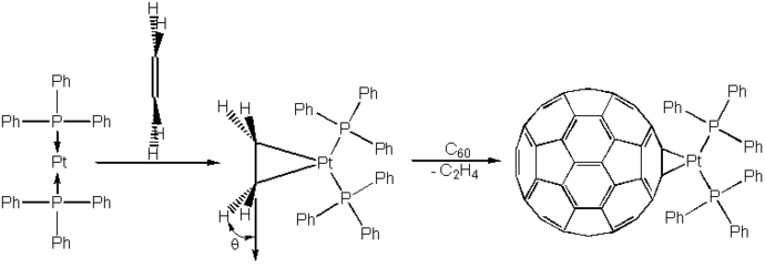 ак, при взаимодействии ди(трифенилфосфин)платины с этиленом (представляющим собой плоскую молекулу) образуется комплекс, сокращенно обозначаемом (Ph3P)2Pt(2-C2H4), в котором атомы водорода в молекуле этилена более не лежат в плоскости, а отклонены на угол , что является мерой прочности донорно-акцепторных связей. Такое изменение конфигурации заместителей усиливается при наличии в молекуле этилена более электроноакцепторных заместителей, чем водород. С раствором фуллерена-60 в толуоле (Ph3P)2Pt(2-C2H4) образует окрашенный в изумрудно-зеленый цвет комплекс (Ph3P)2Pt(2-C60).