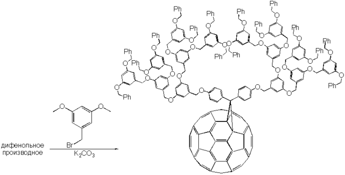 интезированный по сходной схеме аддукт содержит электроноизбыточную диметоксифельную группу и электронодифицитный C60 в составе одной молекулы, что обусловливает внутримолекулярное донорно-акцепторное взаимодействие: