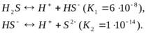 ероводород — типичный восстановитель. В кислороде он сгорает. Раствор сероводорода в воде представляет собой очень слабую сероводородную кислоту, которая диссоциирует ступенчато и в основном по первой ступени: