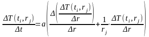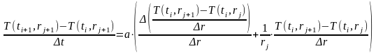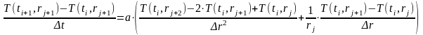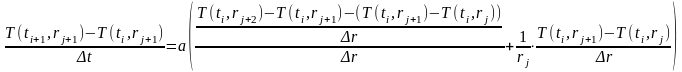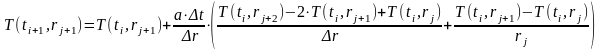 T(i+1,j+1)=T(i,j+1)+(a*dt/dr)*(((T(i,j+2)-2*T(i,j+1)+T(i,j))/dr)+((1/r)*(T(i,j+2)-T(i,j+1))));