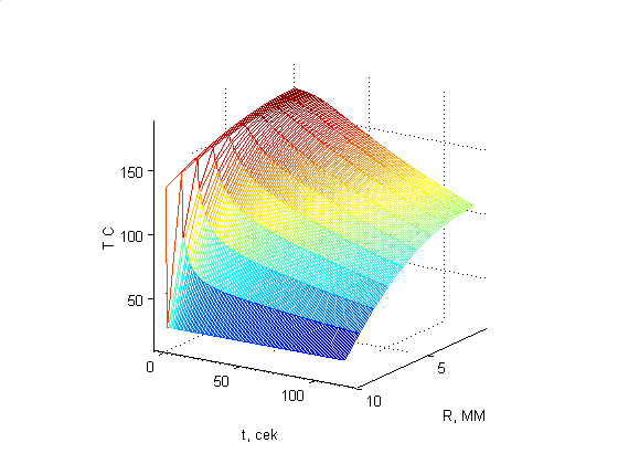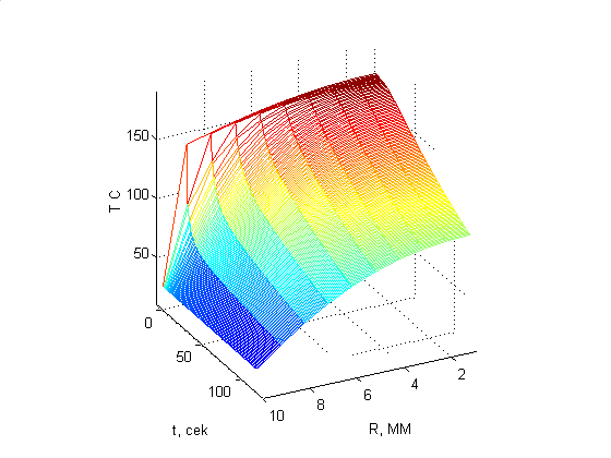 Построим поверхность описывающую полученную функциональную зависимость T(t,r):