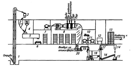 При необходимости транспортировки на дальние расстояния культуру гриба дробят на шнеке-дробилке 10 и дезинтеграторе 11 до получения частиц размером не более 10 мм и высушивают в сушилке 18 теплым воздухом до содержания влаги не более 10... 12 %. Воздух нагревают в калорифере 20 и подают в сушилку вентилятором 19. Отработавший воздух удаляют вентилятором 17 и выбрасывают в атмосферу через циклон 14. Высушенную культуру шнеком 16 подают на весы 75 для фасования. Сюда же подаются уловленные в циклоне частички культуры, унесенные воздухом. Освободившиеся кюветы проходят через мойку 12, обеспложиваются в стерилизаторе 13 и возвращаются под загрузку.