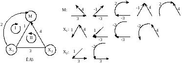 Деревом называется любая последовательность дуг графа, не содержащая циклов. Максимальным деревом (или каркасом) называют последовательность дуг, проходящую через все вершины и не содержащую циклов. Корневым деревом, или деревом, имеющим корень в вершине i (каркас вершины i), называют максимальное дерево, все дуги которого направлены к вершине i. Для КГ5 двухмаршрутной каталитической реакции приведены корневые деревья для вершин М, X1 и X2.