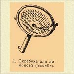 Следующей ступенью способа является употребление особого скребка, называемого во Франции, где он почти исключительно и применяется, "l'écuelle". Скребок этот (см. рис. ниже) состоит из оловянной тарелки A диаметром в 20 см; посредине ее имеется круглое, в 2 см диаметром, отверстие и к нему с выпуклой стороны тарелки припаяна трубка C с донышком. Тарелка A усажена 150 бронзовыми шипами, расположенными пятью концентрическими рядами.