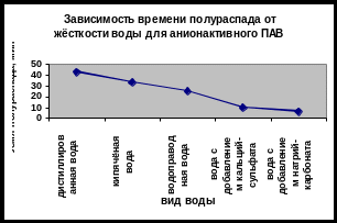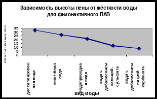 Как видно, с ростом жёсткости воды объём полученной пены резко уменьшается. Причиной этого является химическая связь ПАВ с ионами, которые присутствуют в воде. Так как ПАВ имеет анионактивный характер, то в растворе происходит взаимодействие анионов ПАВ и катионов кальция и магния: